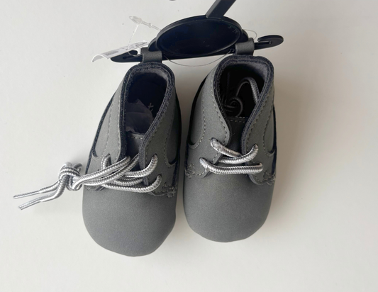 Brand new, unworn grey baby shoes with grey and white laces.