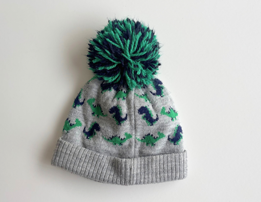 Lovely grey knitted hat with green and navy dinosaur pattern and bobble!