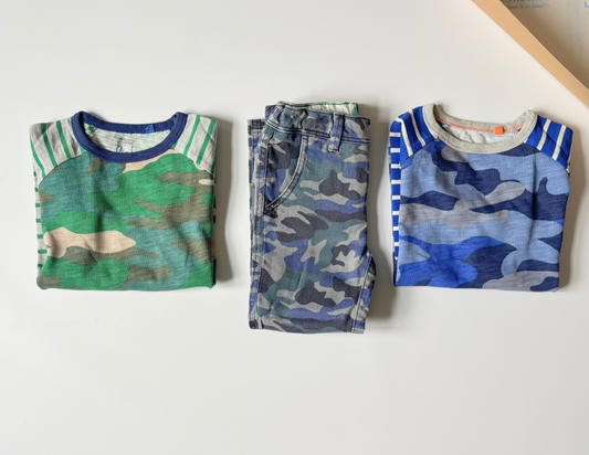 - Blue camouflage top with striped sleeves