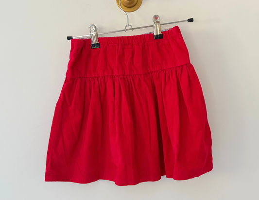 Red corduroy capped sleeve dress with collar, tulle-lined skirt and button fastening.