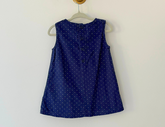 Navy blue corduroy dress with white polka dot pattern and embroidered robin motif and button fastening.