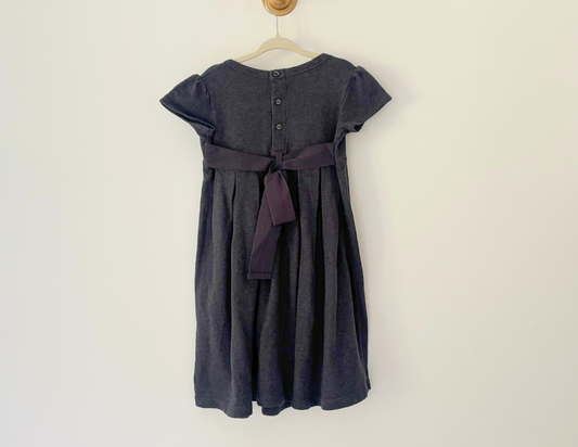 Timeless charcoal grey charcoal dress with full skirt, button fastening and bow on the back.