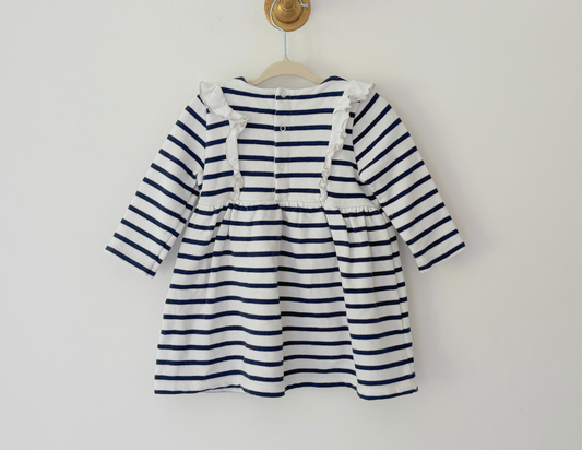 Gorgeous nautical-style jersey dress with navy and white stripes, frill shoulders and silver buttons on chest. Popper fastening on the reverse.