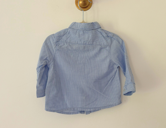 A gorgeous blue and white pinstripe 100% cotton shirt with white buttons, pocket detail and navy stitch detail on bottom button.