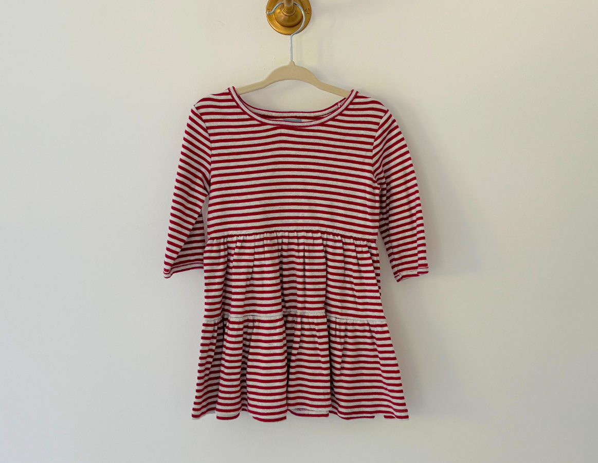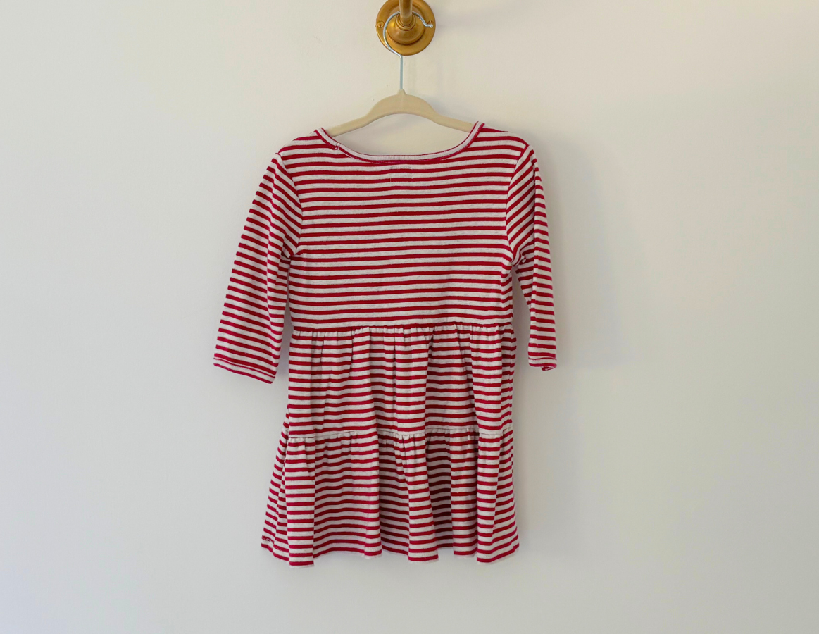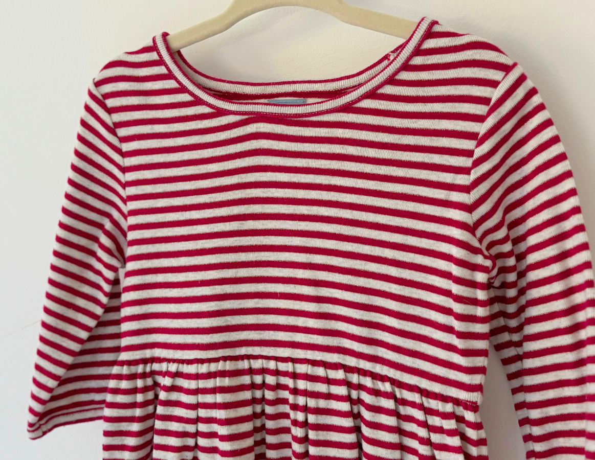 Lovely candy stripe cotton dress with silver metallic thread detail.