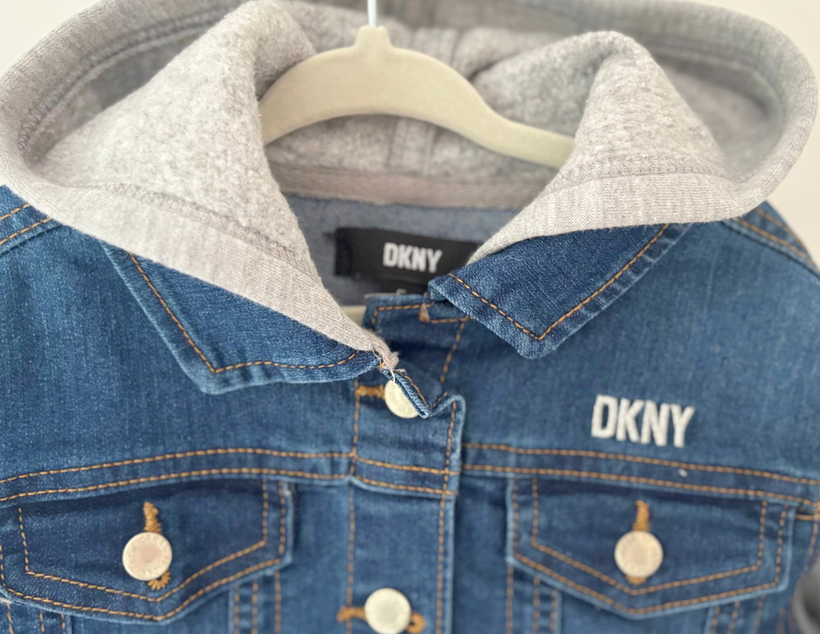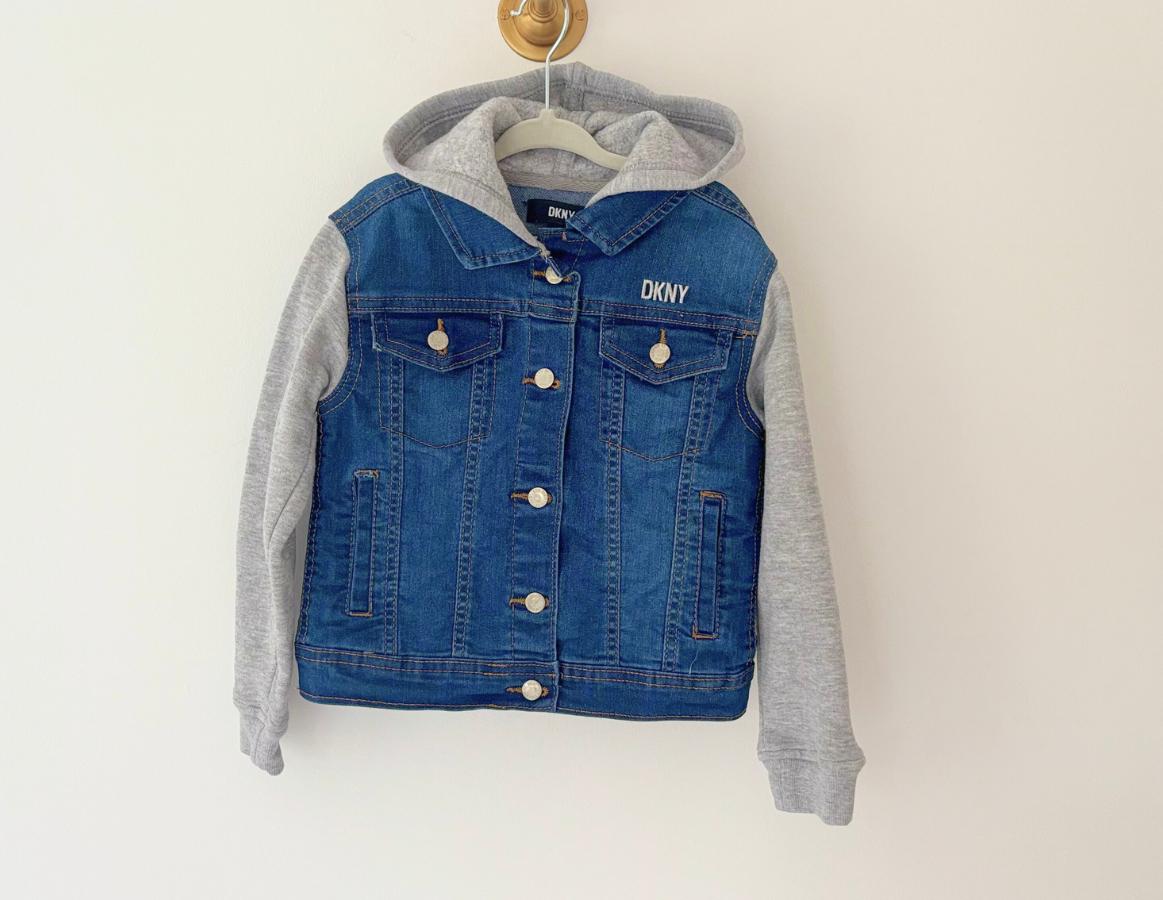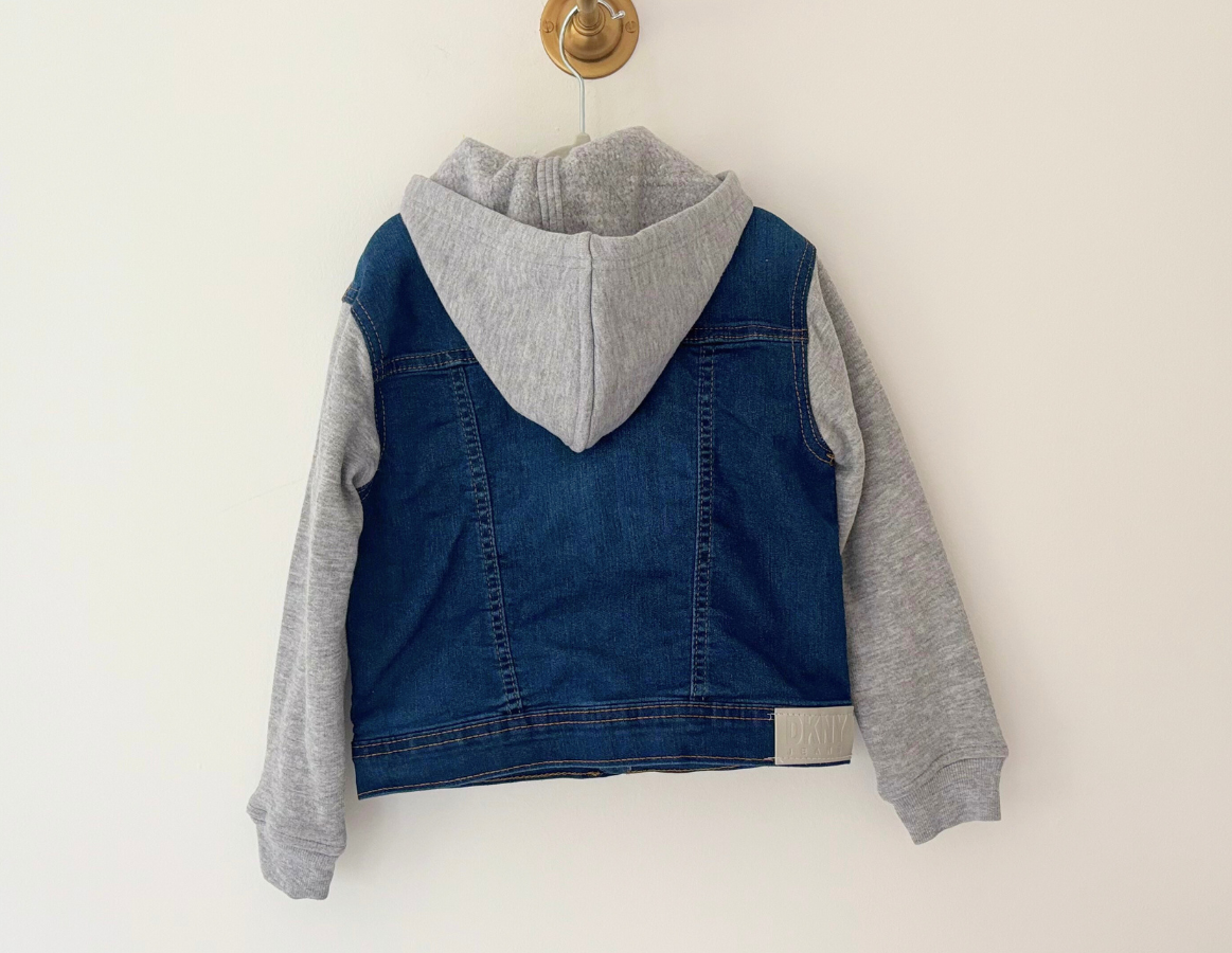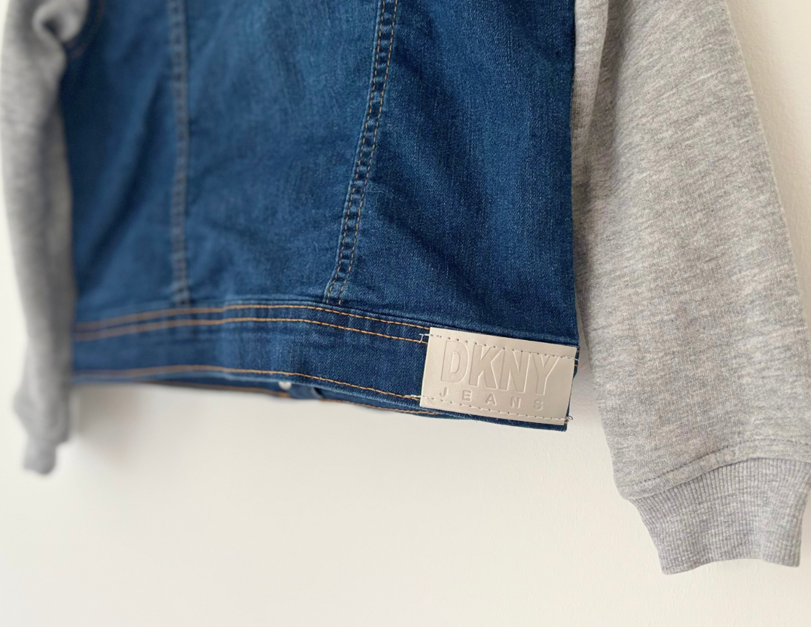 Fabulous denim jacket with grey jersey integrated sleeves and hoodie. Popper fastenings and collar. In excellent condition.