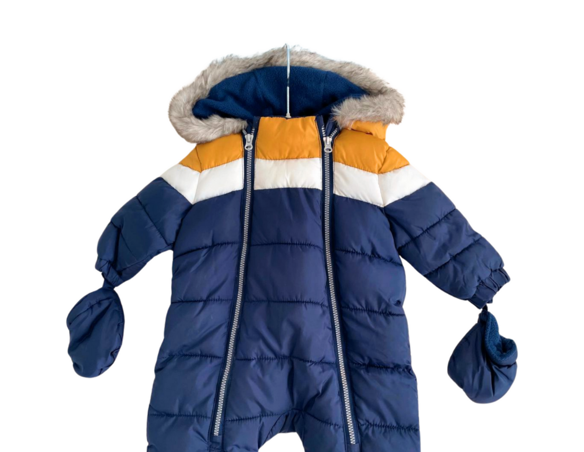 Navy blue fleece lined snowsuit with detachable mittens. Striped pattern, faux fur trim on hood and zip fastening.