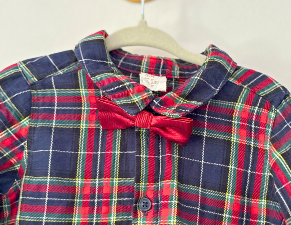 Gorgeous tartan shirt with matching silk bow tie with elasticated fastening.