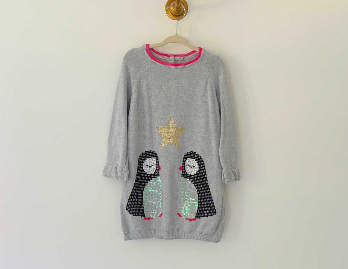 Grey knitted dress with embroidered sequin penguin pattern and ruffle cuffs on sleeves. Button fastening on rear.