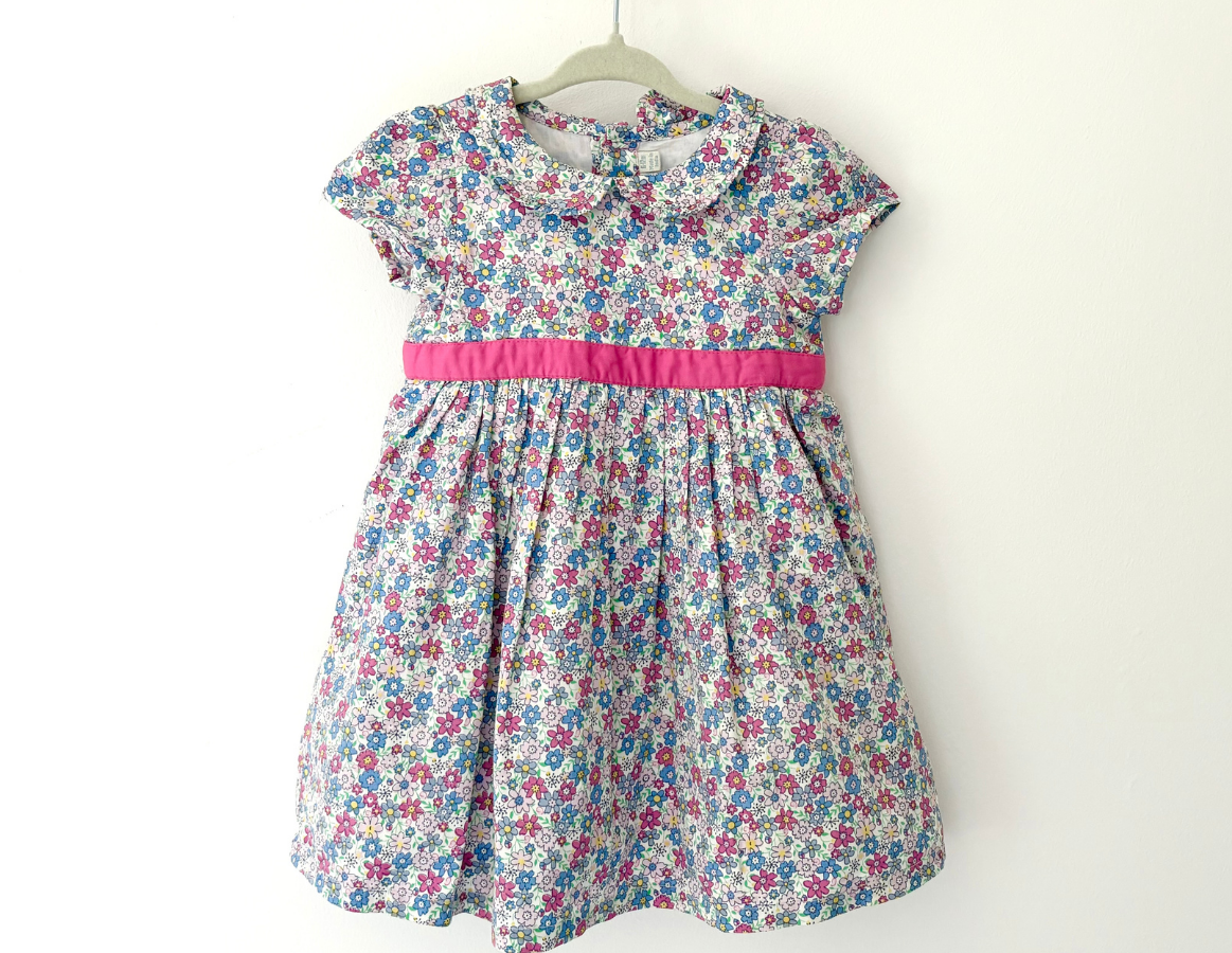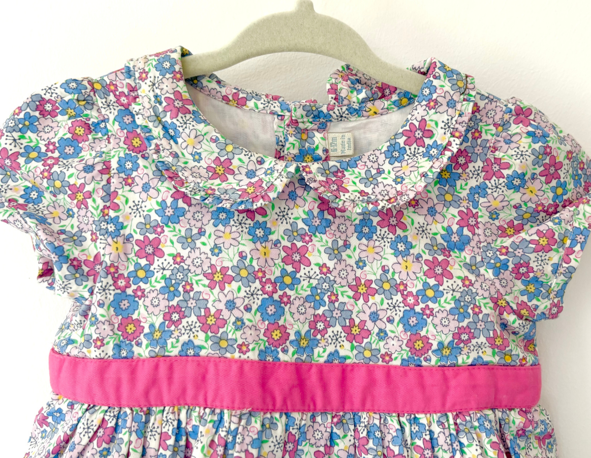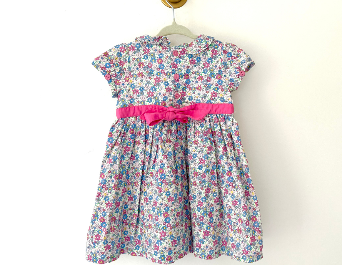 Beautiful floral smock party dress with tulle-lined skirt and button fastening on reverse with pink bow tie.