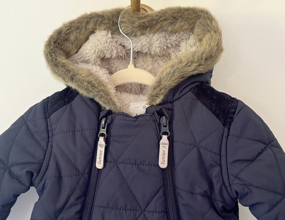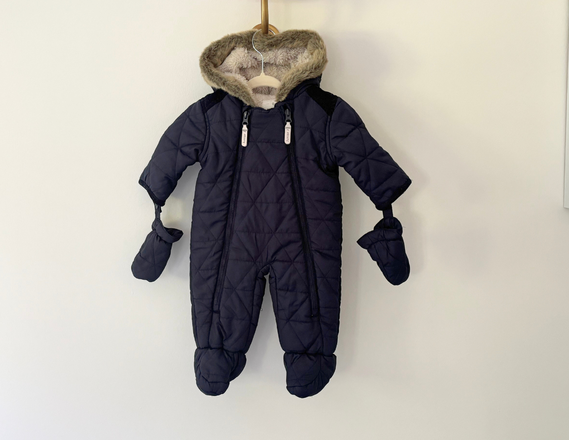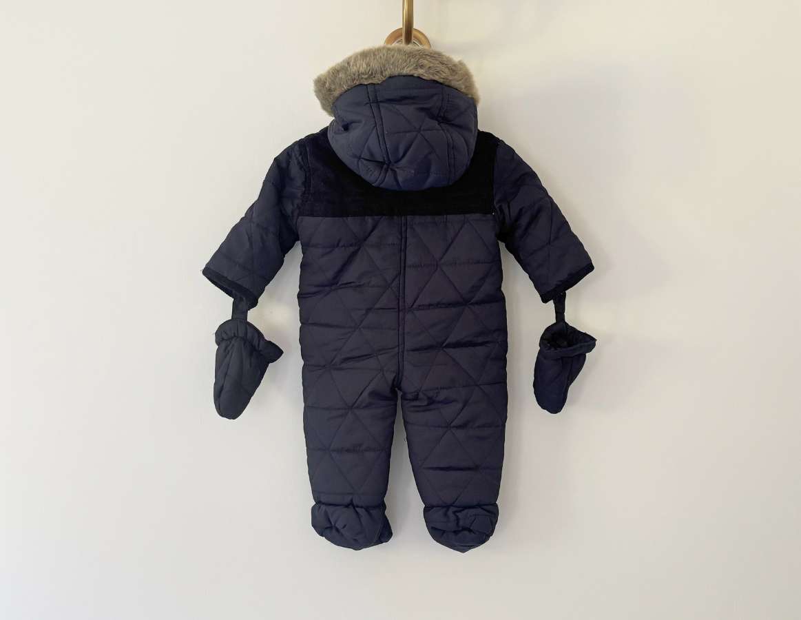 Navy blue fleece lined quilted snow suit with detachable mittens, faux fur trimmed hood and zip fastening.