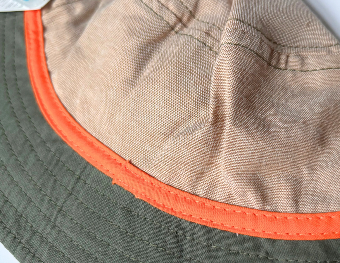 Gorgeous tan, orange and khaki bucket-style sun hat by Kitti, with embroidered "No Brakes" monster truck emblem.