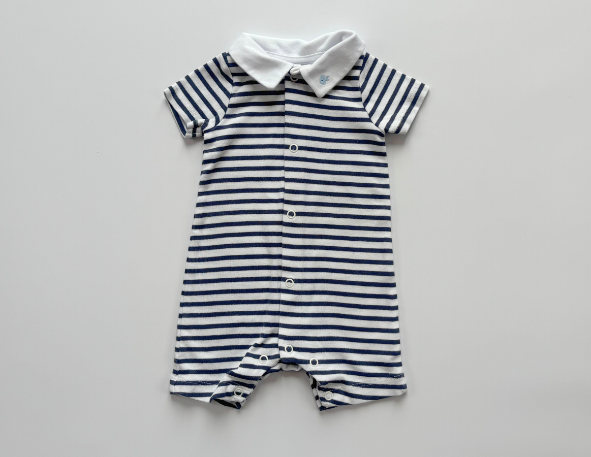 - Little White Company navy stripe collared summer romper with embroidered fish on collar