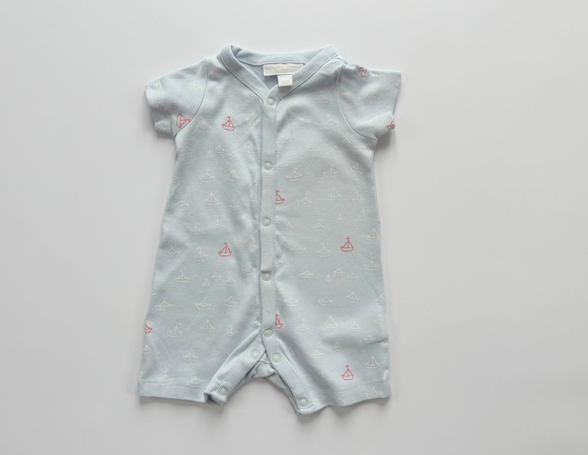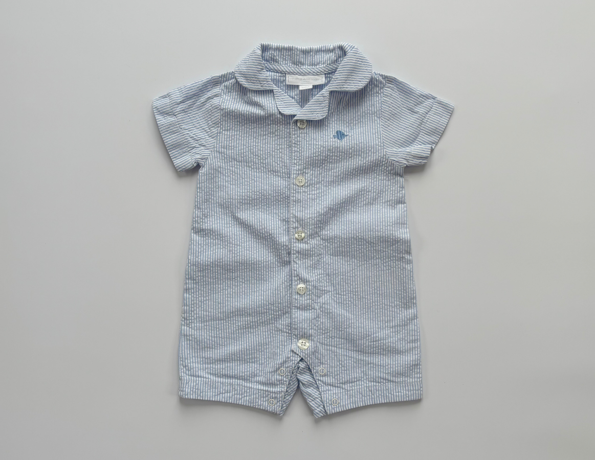- Little White Company pastel blue pinstripe collared cotton romper with embroidered fish emblem