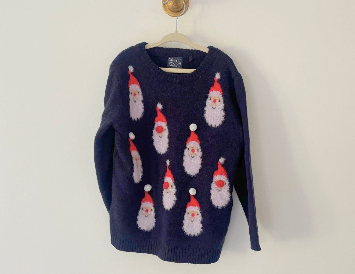 Gorgeous navy knitted jumper with Santa pattern - some Santas have red pom pom noses!