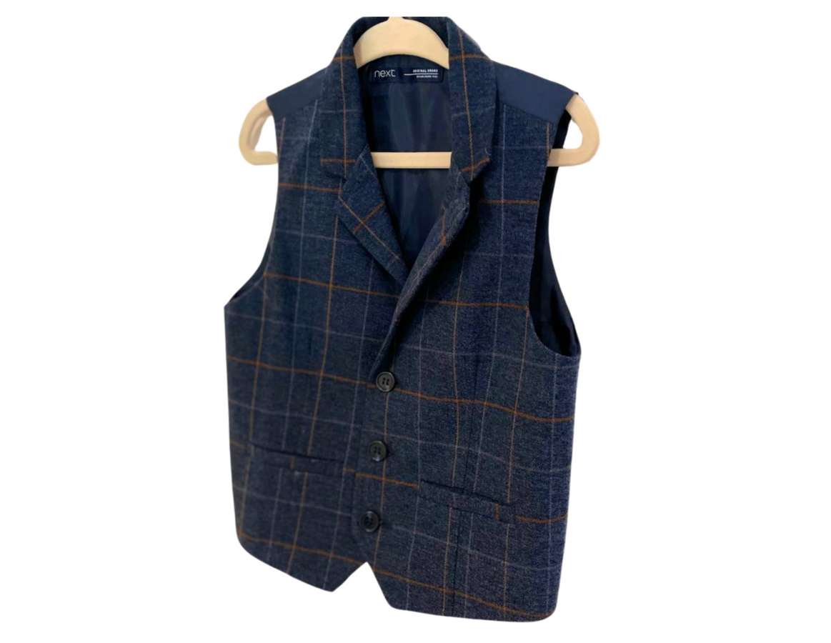 Navy blue "tweed" check waistcoat and trouser set with removable braces.