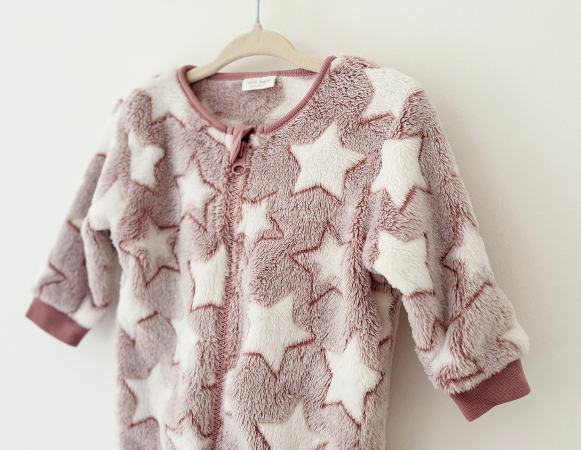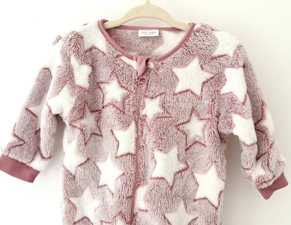 Gorgeous fleece onesie with zip fastening and blush pink and white star pattern.