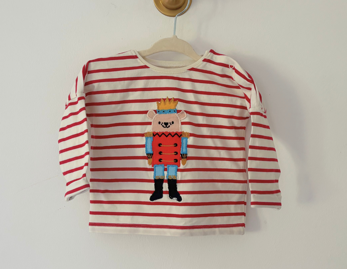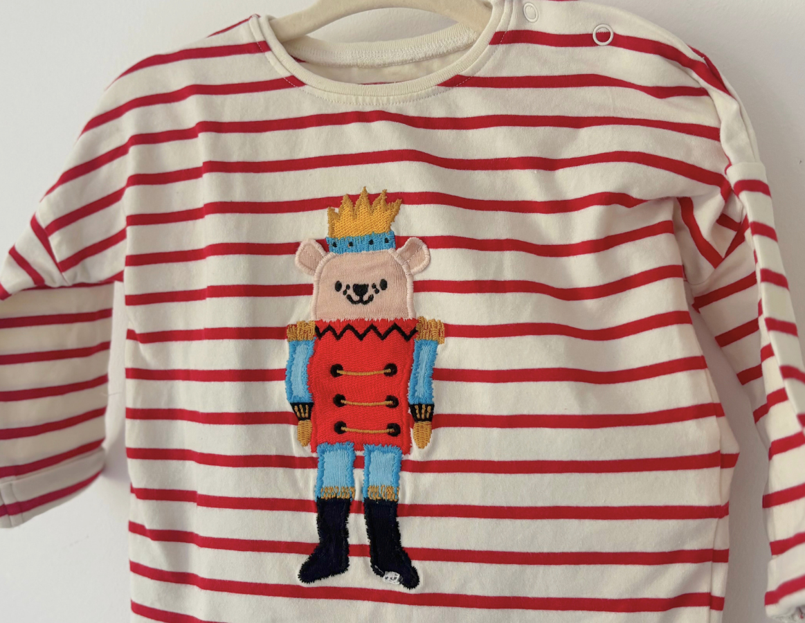 Simply lovely cotton twin set with in teddy bear nutcracker print. Includes striped log sleeved t-shirt with popper fastening on shoulder, and matching navy printed leggings.