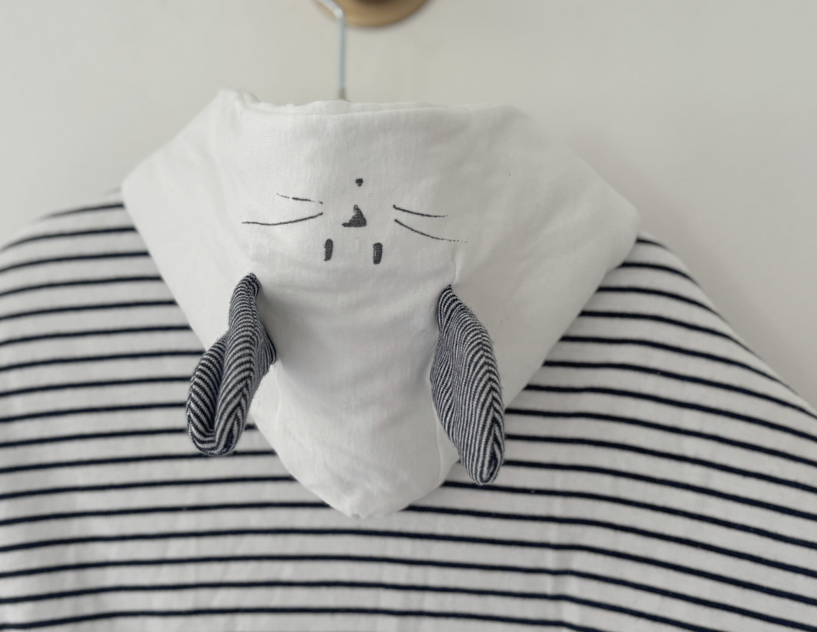 Stunning nautical stripe padded cape with popper fastenings and beautiful rabbit detail and ears on the hood.