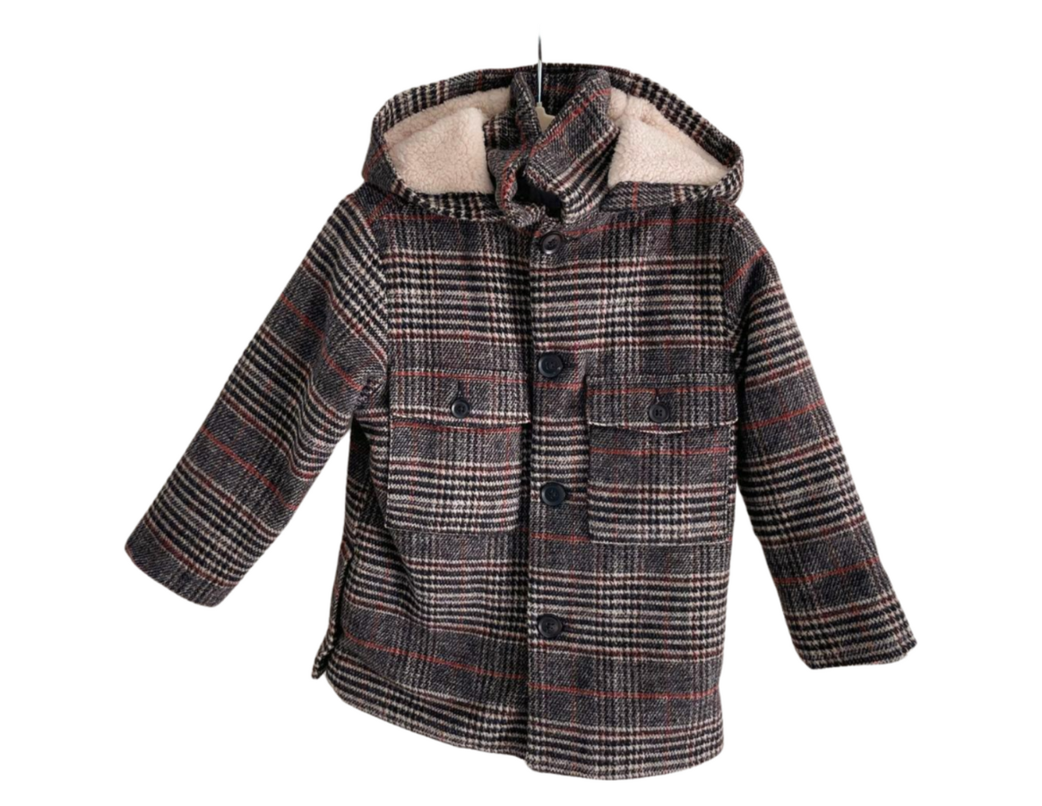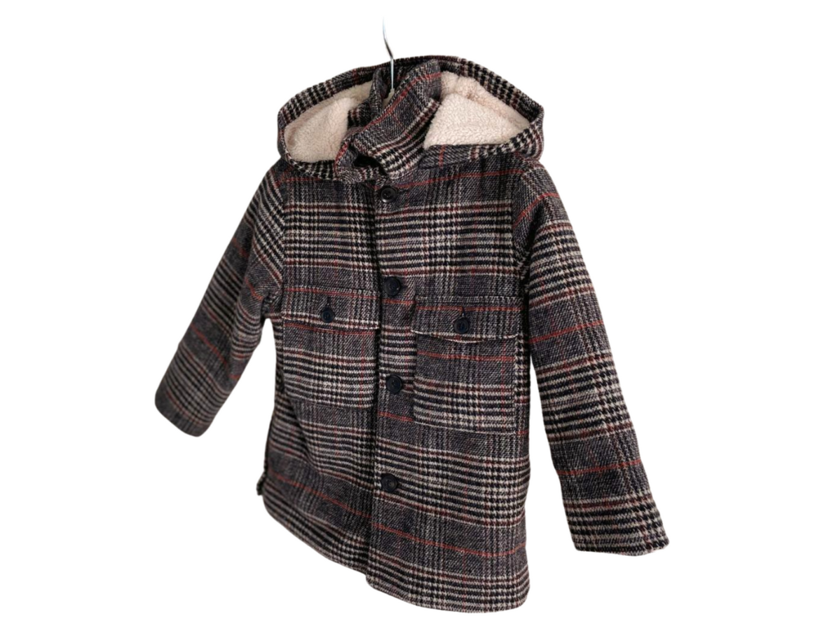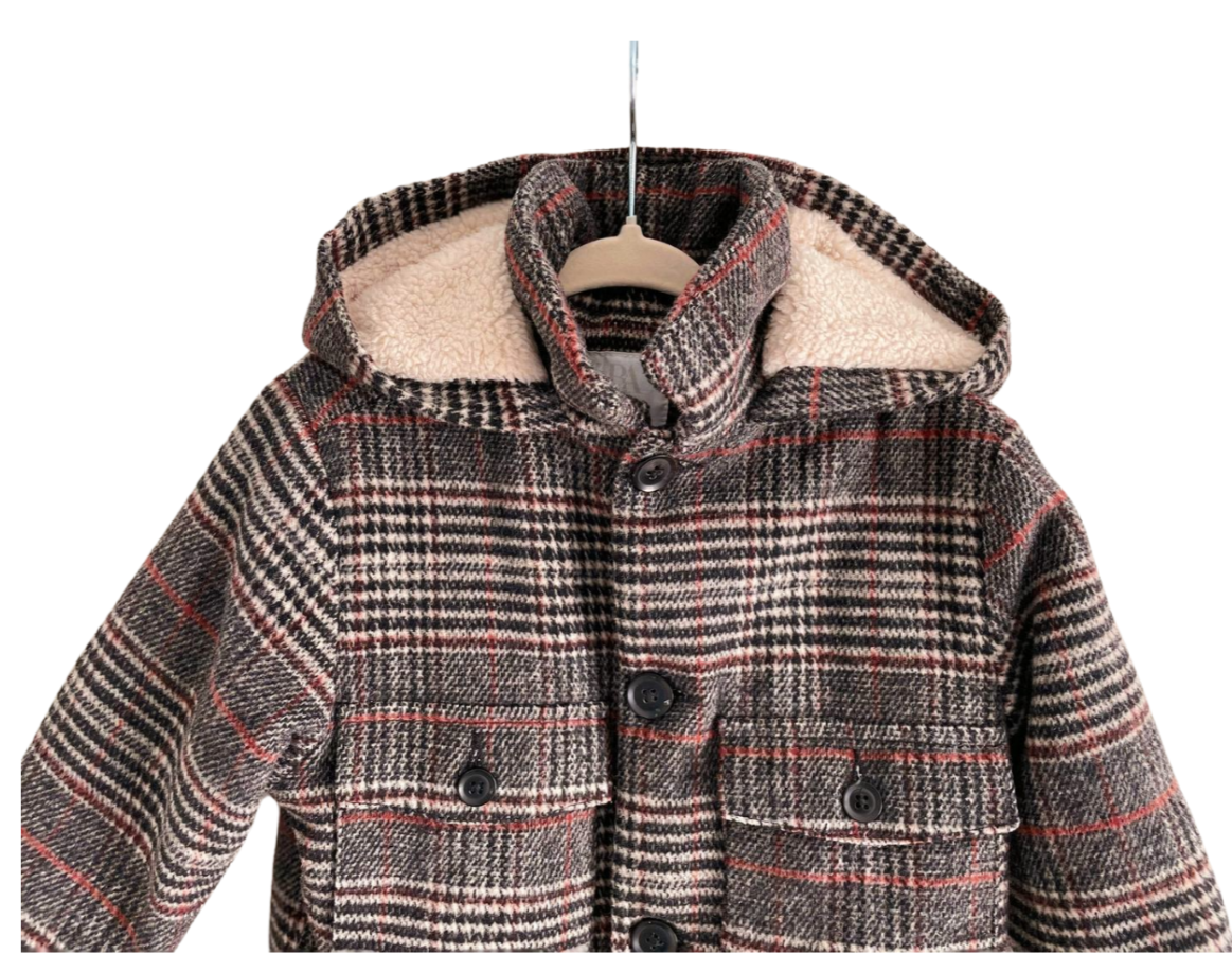 Fleece lined winter coat with herringbone pattern, button fastening and buttoned pockets.